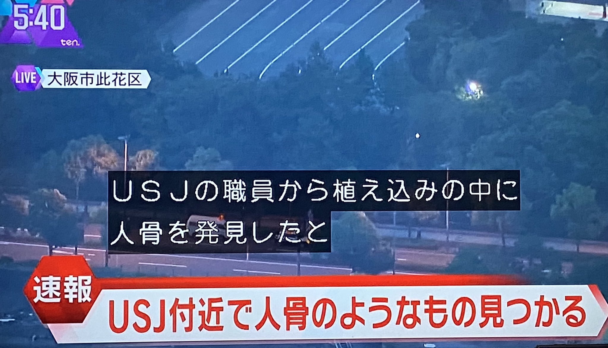 ニュース 速報USJ外縁の植え込みで人骨のようなもの見つかる 警察は事件と事故の両面で捜査関西テレビ - Yahooニュース - Yahooニュース 2022-10-12 速報.